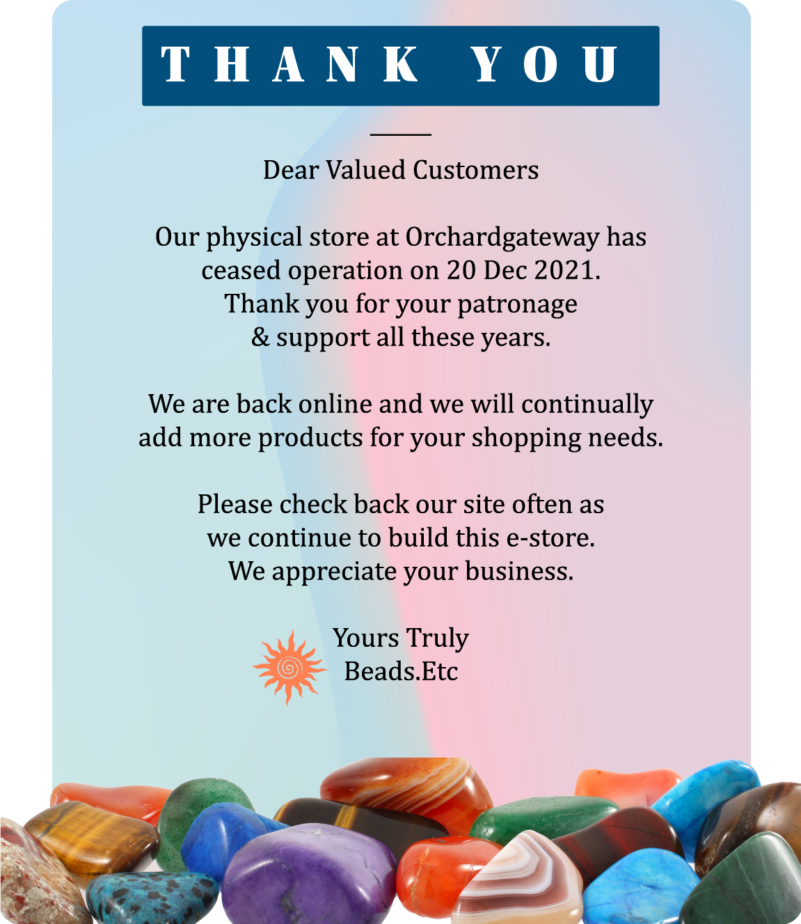 Beads.Etc has its humble beginning in the Tanglin Mall back in 1995. The size of the shop was only about 300sq/ft and it operated under the name "Body-Décor Trading". In 1997, it opened its door in the Heeren at Orchard Road under the current name "Beads.Etc". In May 2012, we moved to Orchard Central & was there till Dec 2015 when unfortunately we had to relocate again to Orchardgateway due to the mall's revamp. After 27 years, we finally decided to close our physical store at Orchardgateway. We will however continue with our online presence.
